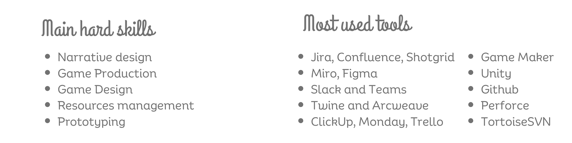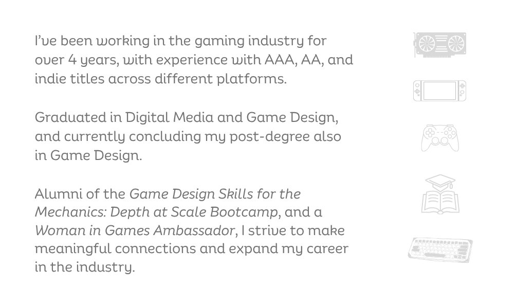 Studios can trust that I learn quickly, support team cohesion, elevate communication, and deliver structured documentation that shortens iteration time. My background allows me to bridge disciplines and remove friction across the development pipeline.